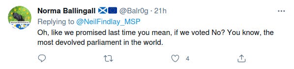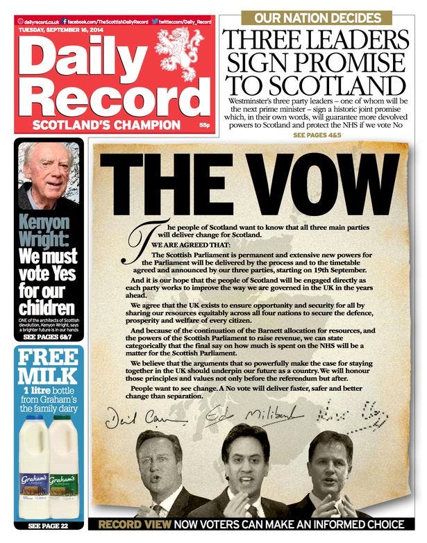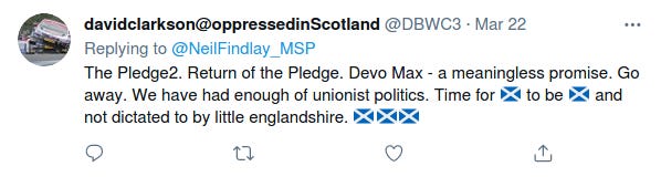 The background to this is that before the 2014 referendum, when Westminster was worried independence would win, the leaders of the Westminster parties all made a vow saying in effect that they loved and respected Scotland and would give it more powers. Many Scots think this promise has been betrayed, and do not trust Westminster to deliver any real devo max.